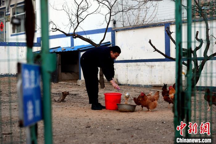 派出所院子里,民警在喂鸡。 杨兵 摄