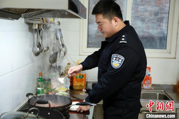 图为民警在做饭。 杨兵 摄