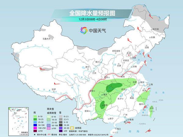 后天,新疆沿天山地区、西藏东南部、内蒙古东北部、川西高原北部、黑龙江中东部等地部分地区有小雪或雨夹雪。江淮大部、江汉、江南北部和西部、西南地区东部、广西西北部等地部分地区有小到中雨。