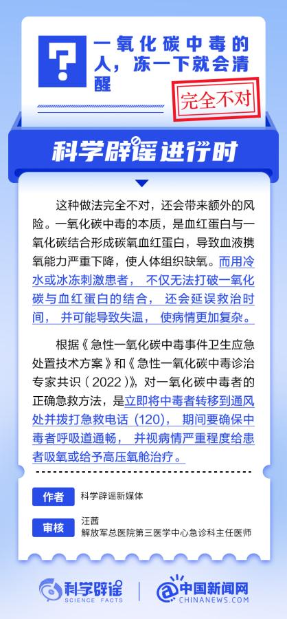 中新网12月27日电 一氧化碳中毒的本质,是血红蛋白与一氧化碳结合形成碳氧血红蛋白,导致血液携氧能力严重下降,使人体组织缺氧。而用冷水或冰冻刺激中毒患者,不仅无法打破一氧化碳与血红蛋白的结合,还会延误救治时间,并可能导致失温,使病情更加复杂。(来源:@科学辟谣中国新闻网微博 )