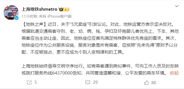 中新网1月3日电 据“上海地铁”微博消息,近日,“5元卖座”引发议论。对此,上海地铁运营方表示坚决反对。根据轨道交通乘客守则,老、幼、病、残、孕妇及怀抱婴儿者优先上、下车,其他乘客应当主动让座,因此,地铁座位应首先满足特殊群体优先有座的需求。其次,地铁座位作为公共服务设施,服务对象是所有乘客,应按照“先来先得”原则予以分配,不应被独占,更不应成为个别人变相谋利的工具。