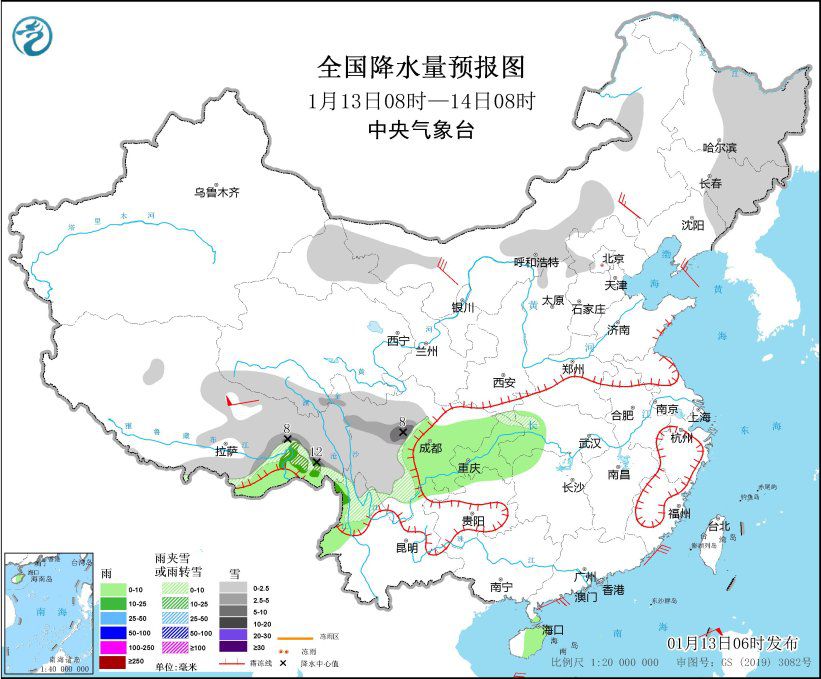 1月13日8时至14日8时,内蒙古西部和中部、甘肃河西、黑龙江中东部、吉林中东部、河北西部、西藏东部、青海南部、川西高原、云南西北部等地部分地区有小到中雪或雨夹雪,其中,西藏东部、川西高原北部等地部分地区有大到暴雪(10~12毫米)。西藏东南部、云南西部、四川盆地、重庆、贵州北部、湖北西南部、湖南西北部、海南岛中东部等地部分地区有小到中雨。内蒙古西部和中东部、华北西北部、西藏中东部、川西高原等地部分地区有4~6级风。
