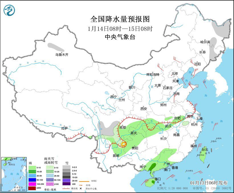 1月14日8时至15日8时,黑龙江东部、吉林东部、新疆沿天山地区、川西高原南部、云南东北部、安徽南部山区等地部分地区有小雪或雨夹雪。云南北部、贵州西部和北部、四川东南部、重庆、湖北中南部、湖南北部、安徽中部、广西东部、广东北部和西部、海南岛、台湾岛等地部分地区有小雨,其中,广西东南部、海南岛东部等地部分地区有中雨。内蒙古中东部、华北大部、辽宁西部、黄淮、西藏中西部等地部分地区有4~6级风。