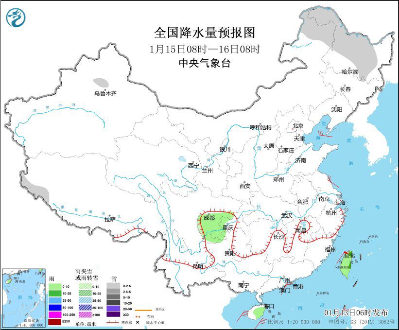 1月15日8时至16日8时,内蒙古东北部、黑龙江中部和北部、西藏西部、川西高原东部等地部分地区有小到中雪或雨夹雪。四川盆地东部、重庆西部、海南岛中东部、台湾岛等地部分地区有小雨,其中,台湾岛东部部分地区有中雨。