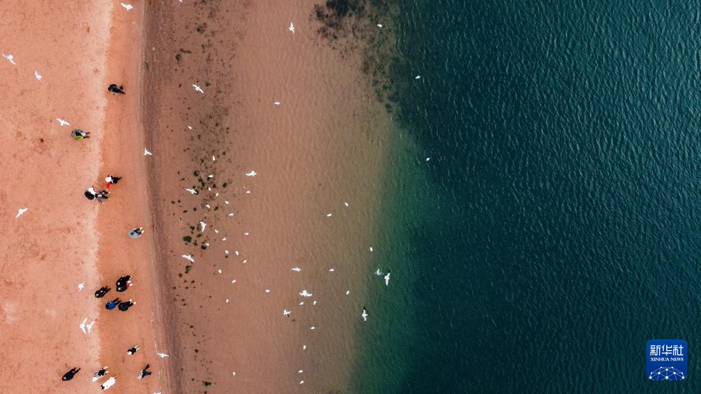 1月12日,游客在抚仙湖边游玩(无人机照片)。