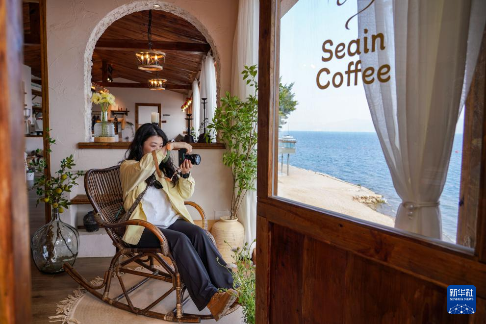 1月12日,一名游客在抚仙湖边的一家咖啡厅里拍照。