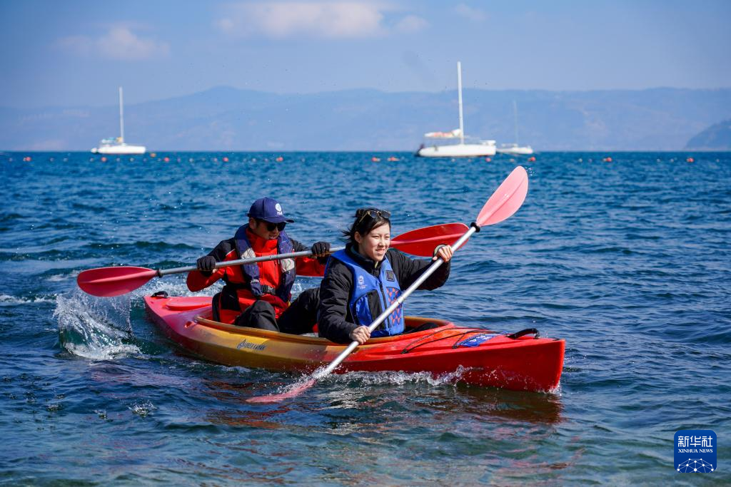 1月12日,游客在抚仙湖上体验帆船和皮划艇。