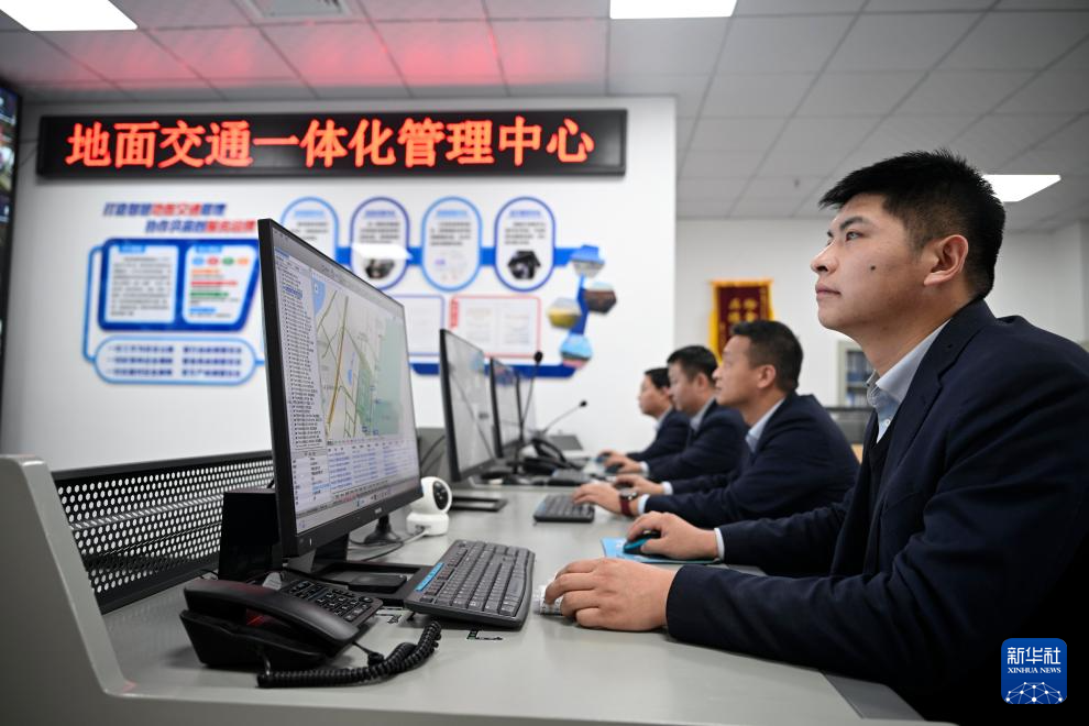 1月17日,银川河东国际机场地面交通一体化管理中心工作人员在对交通状况进行监控。