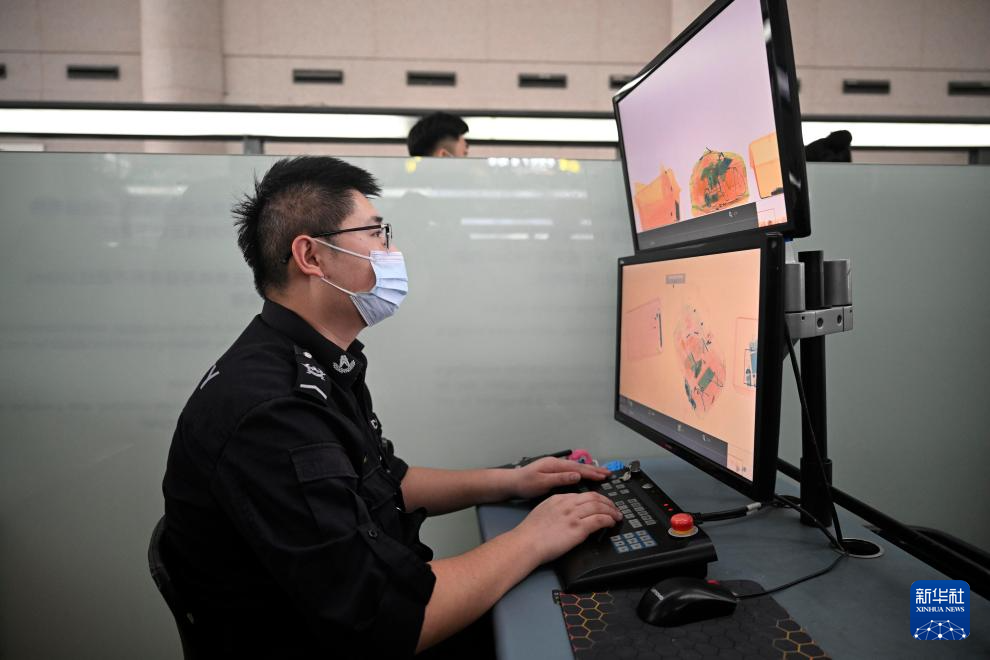 1月17日,银川河东国际机场安检员王立伟在安检通道对旅客行李进行安检。