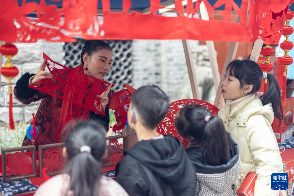 1月21日,在重庆市巴南区西流沱小镇,非遗剪纸传承人向小朋友介绍剪纸。