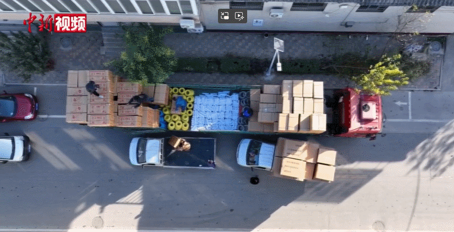 街道两旁装货的车辆。中新视频 截图