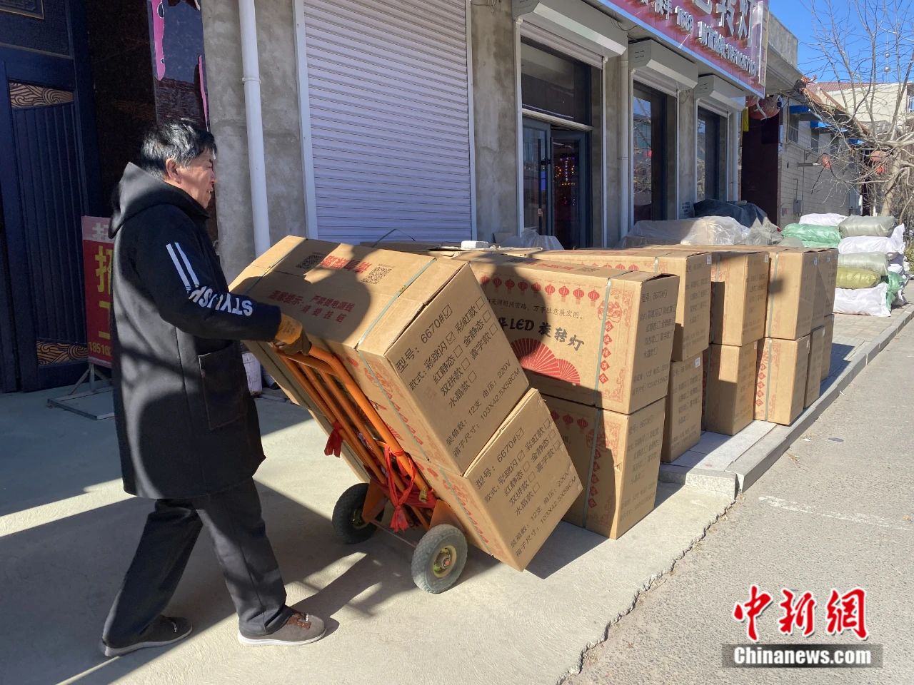 工人正在运送打包好的灯笼制品,以备装车发往全国各地。 李玉素摄