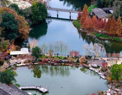 1月31日,人们在昆明海洪湿地公园水杉林间划船(无人机照片)。