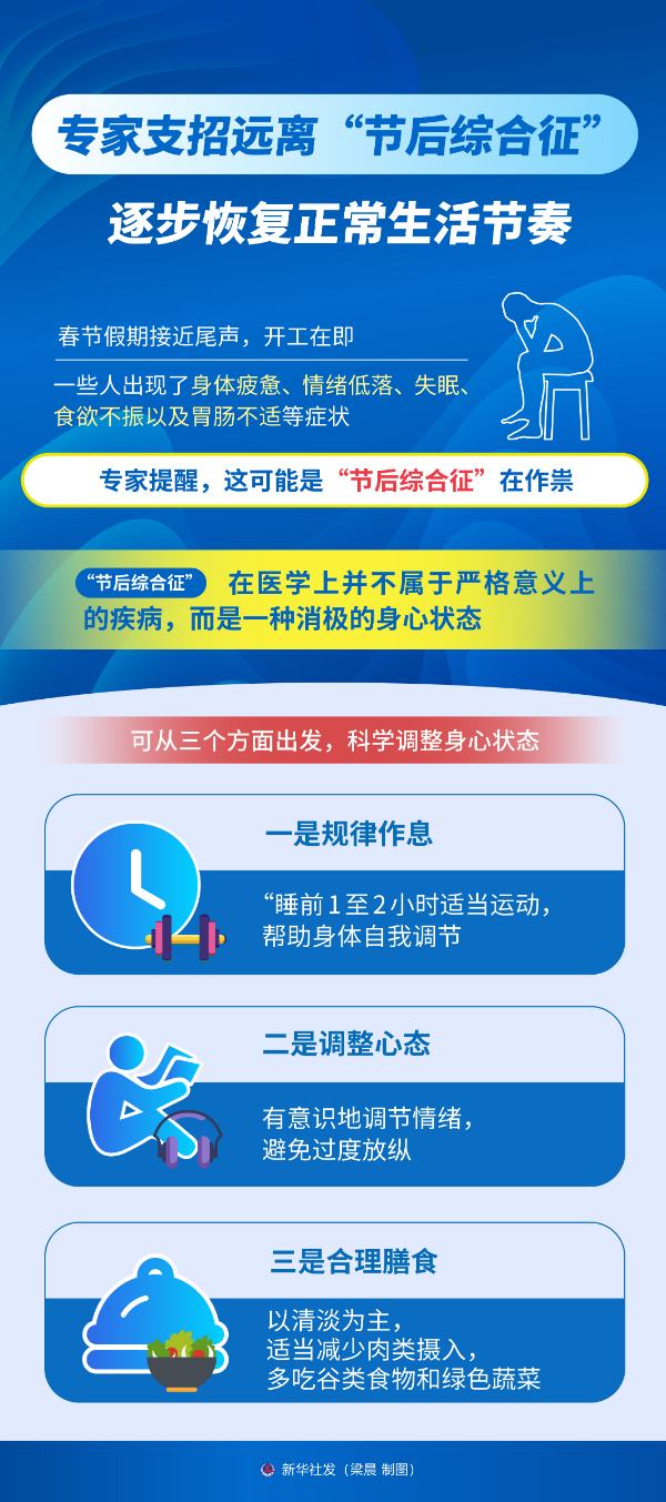 新华社大连2月4日电(记者 张博群)春节假期接近尾声,开工在即,一些人出现了身体疲惫、情绪低落、失眠、食欲不振以及胃肠不适等症状。专家提醒,这可能是“节后综合征”在作祟,应尽快调整作息,保持规律饮食,适当增加运动量,逐步恢复工作节奏,帮助身心重回正轨。