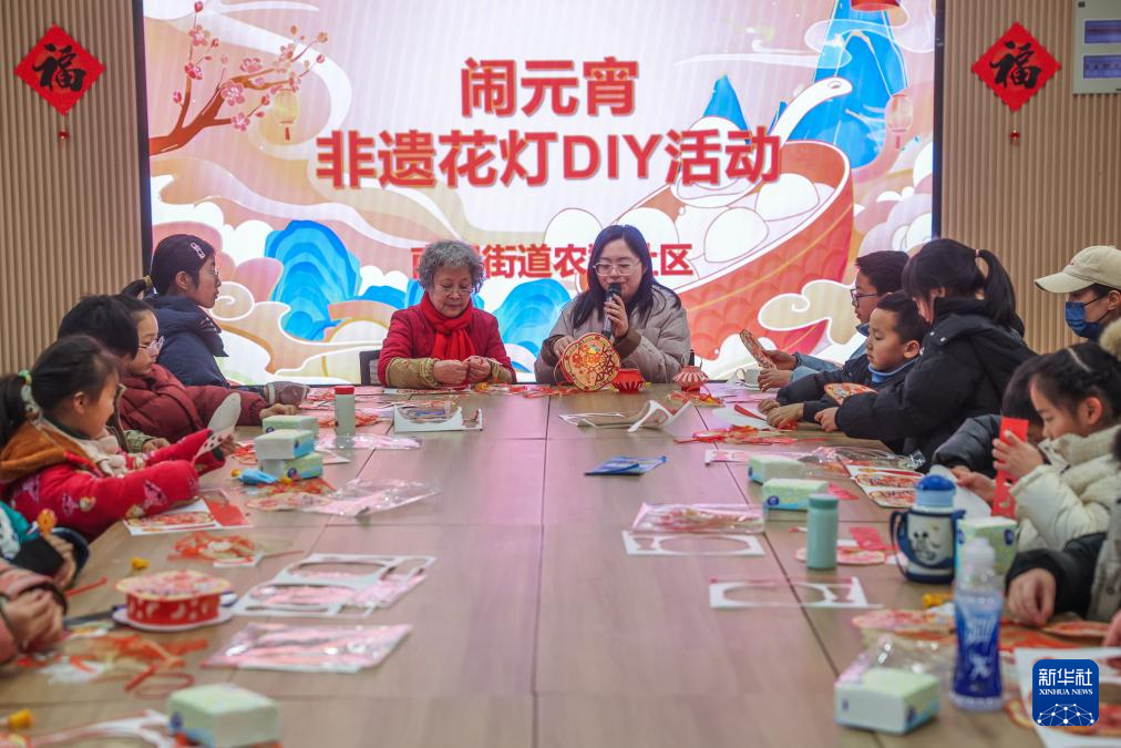 2月6日,嘉兴市南湖区南湖街道农翔社区的志愿者带领居民一起做元宵花灯。