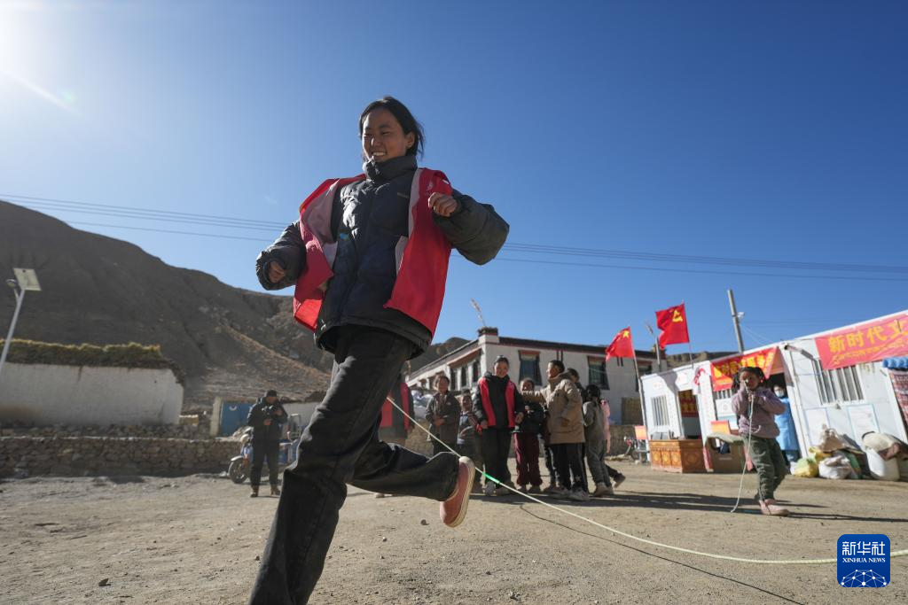 1月25日,在定日县曲洛乡热木青村安置点,大学生志愿者在安置点和孩子们一起玩游戏。