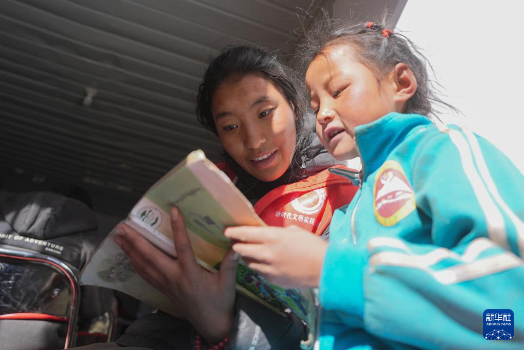 1月25日,在定日县曲洛乡热木青村安置点,大学生志愿者在安置点在给孩子们辅导功课。