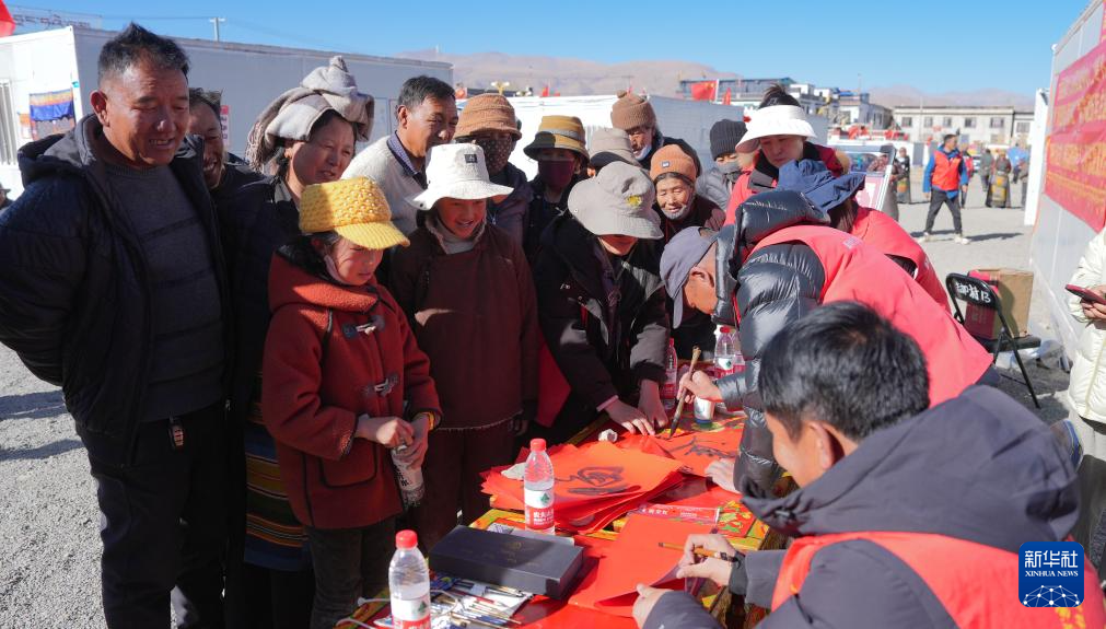 1月26日,书法家协会的志愿者在拉孜县吉如村安置点为受灾群众书写春联。
