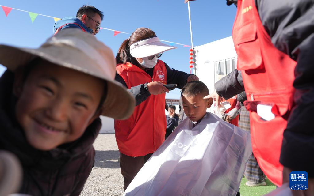 1月26日,志愿者在拉孜县吉如村安置点给孩子们理发。