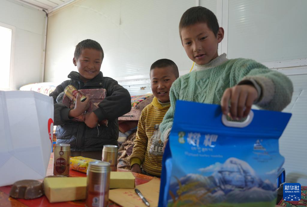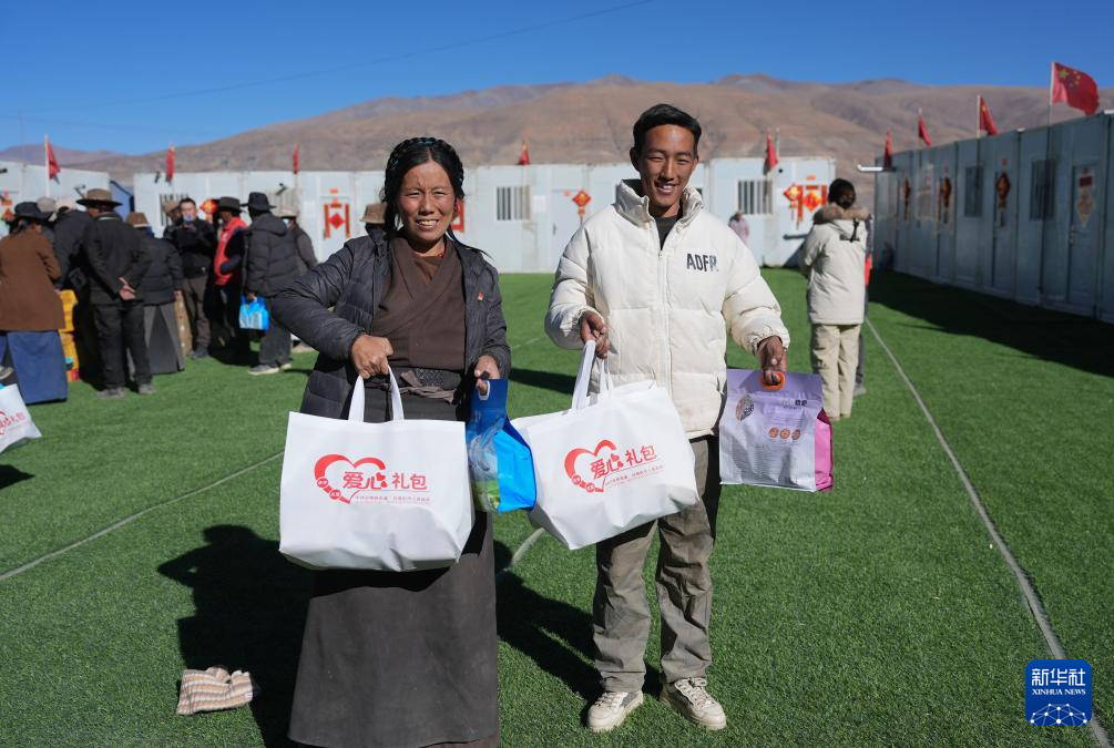 1月27日,拉孜县加嘎村安置点受灾群众领到新年大礼包。