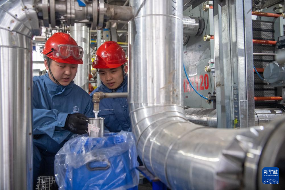 2月11日,在重庆市长寿区的中国石化川维化工VAE(醋酸乙烯-乙烯共聚乳液)项目,工作人员在进行产品采样。