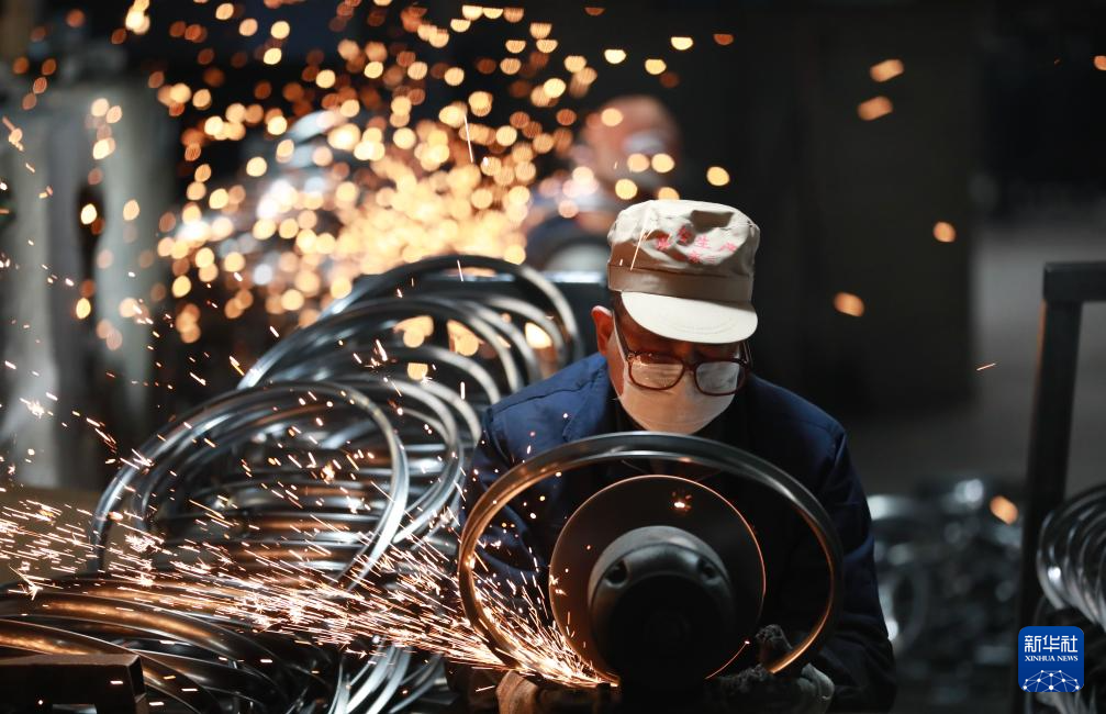 2月11日,在浙江省杭州市临安区天目山镇一家外贸企业,工人在对准备销往海外的自行车钢圈进行抛光作业。