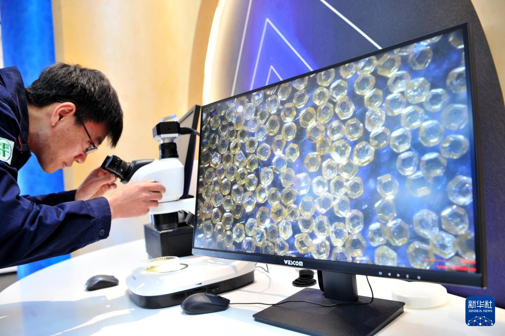 2月11日,在湖北省宜昌市夷陵区一家钻石生产加工企业,工人在检查金刚石单晶的质量。