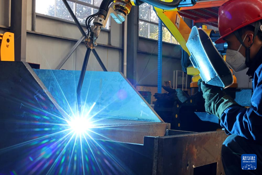 2月10日,在山东省枣庄市齐村镇一家工业制造企业,工人在查看机械臂的焊接情况。