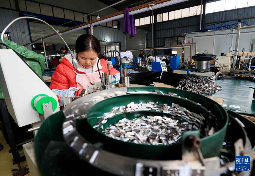 2月10日,在河南省商丘市睢县科创产业园一电子线束生产厂家车间内,工人在生产线上赶制电子线束订单。