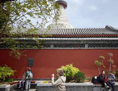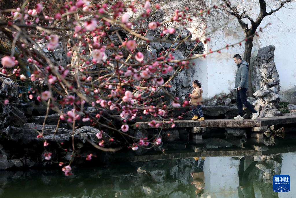 2月16日,游客在江苏苏州古典园林艺圃赏花游玩。