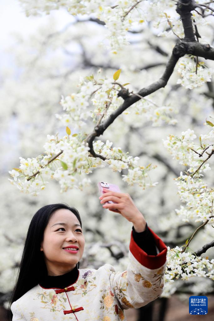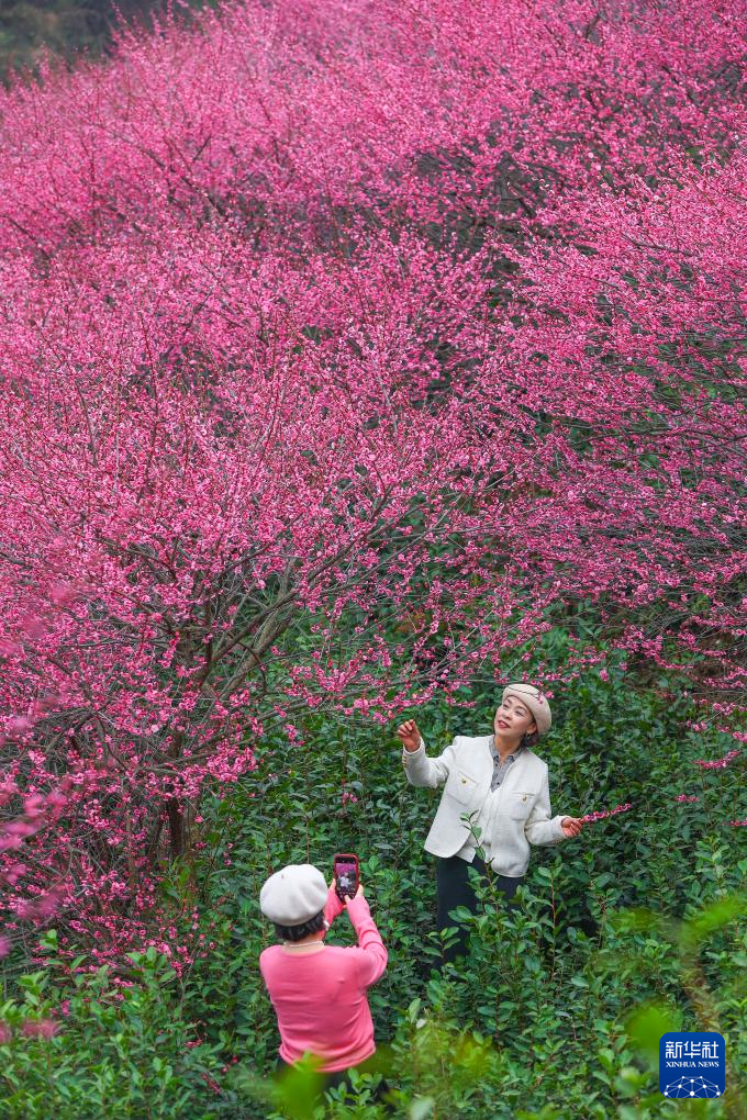 2月15日,在广西贺州市八步区莲塘镇美仪村,游客在山楂树下赏花拍照。