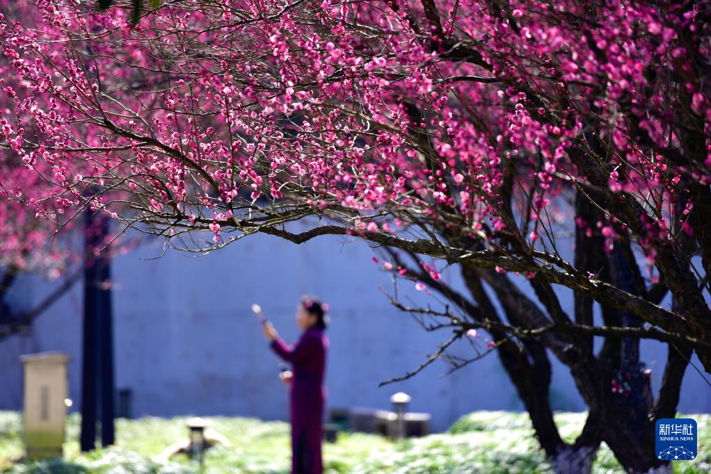 2月18日,游客在浙江省宁波市鄞州区一处公园内赏梅拍照。