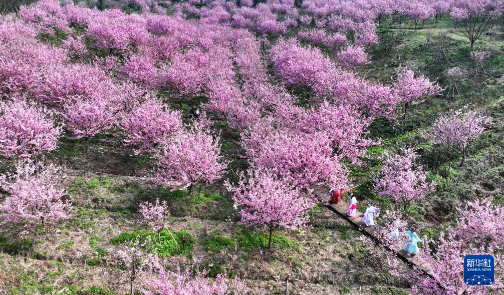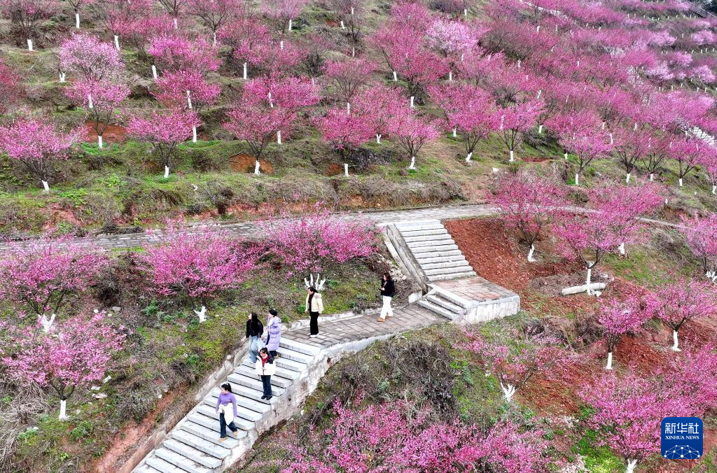2月15日,游人在四川省泸州市江阳区丹林镇樱花谷景区踏青赏花(无人机照片)。