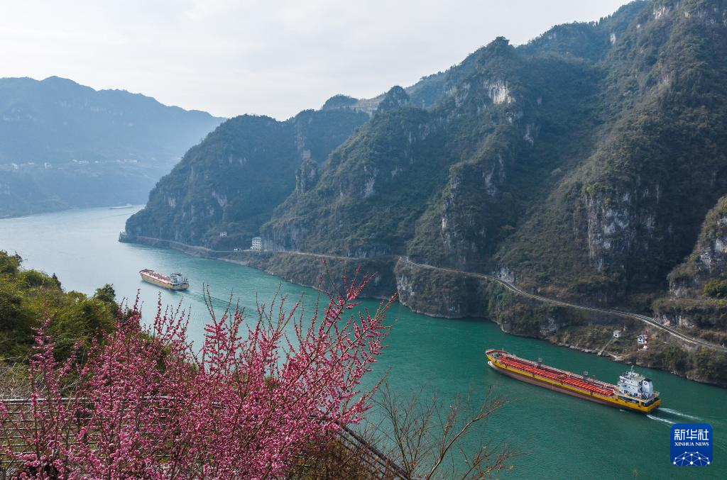 2月16日,船舶行驶在两岸山花盛开的湖北省宜昌市夷陵区长江水域(无人机照片)。