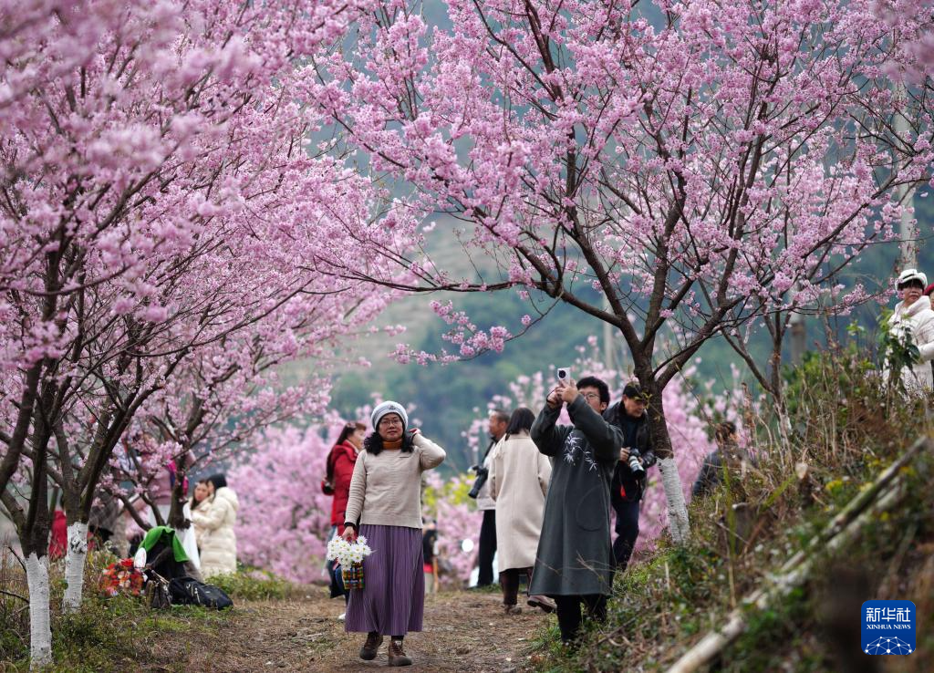 2月19日,游客在广西灵川县三街镇普贤村富丘生态园赏花游玩。