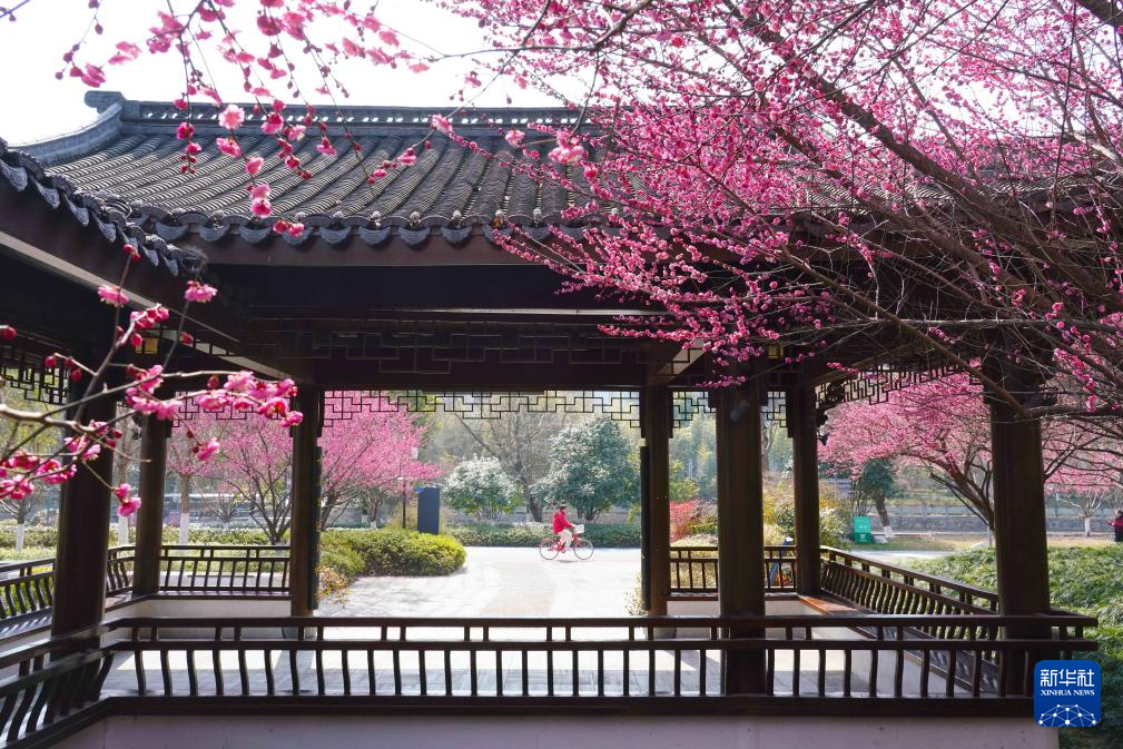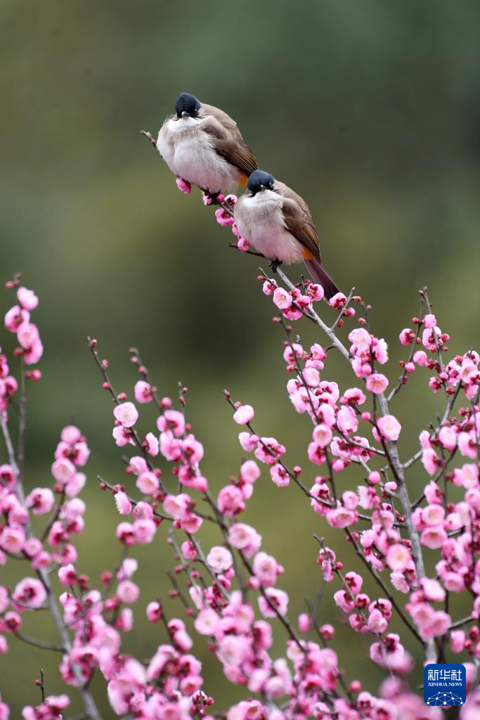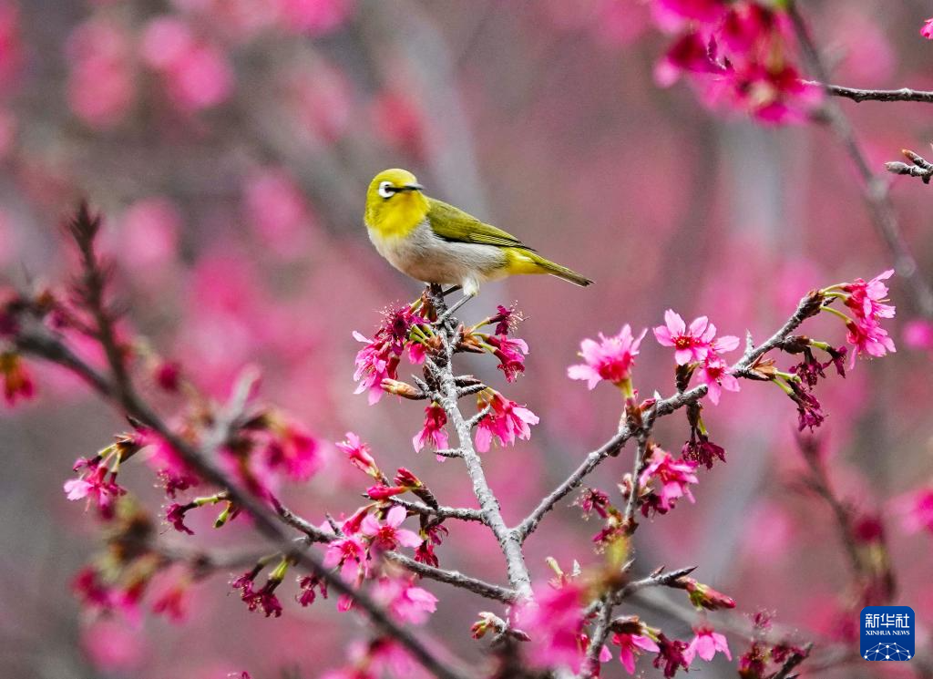 2月16日,在江西省吉安市永丰县恩江湿地公园,小鸟在盛开的樱花枝头停歇。