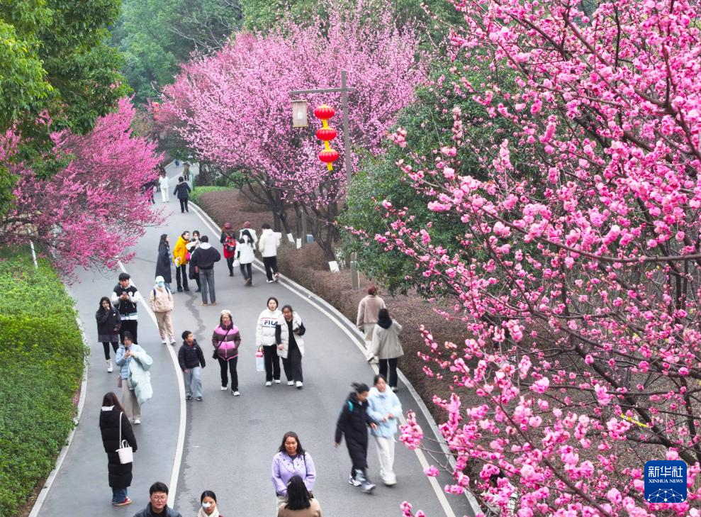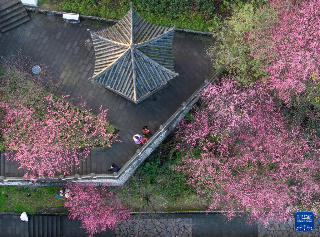 2月12日,人们在重庆市江北区鸿恩寺公园赏花游玩(无人机照片)。