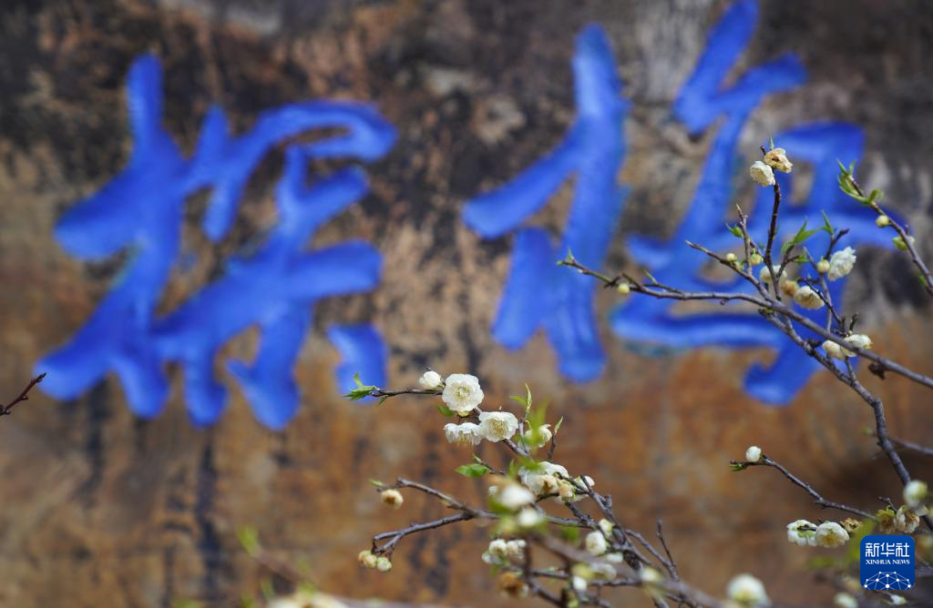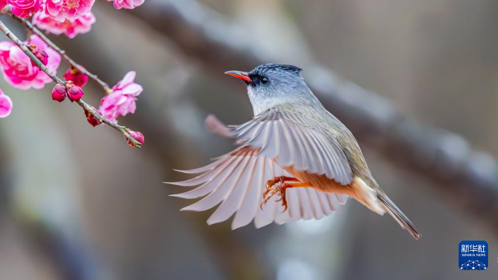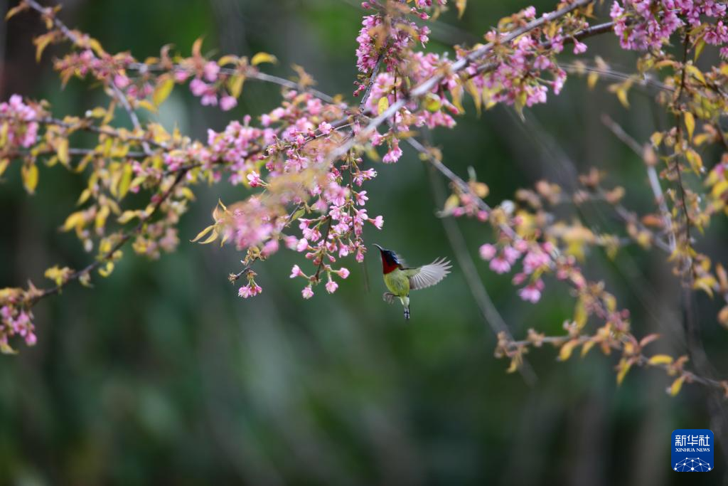 2月15日,在湖南省湘西土家族苗族自治州龙山县华塘街道象鼻社区,一只小鸟在花丛中飞舞。