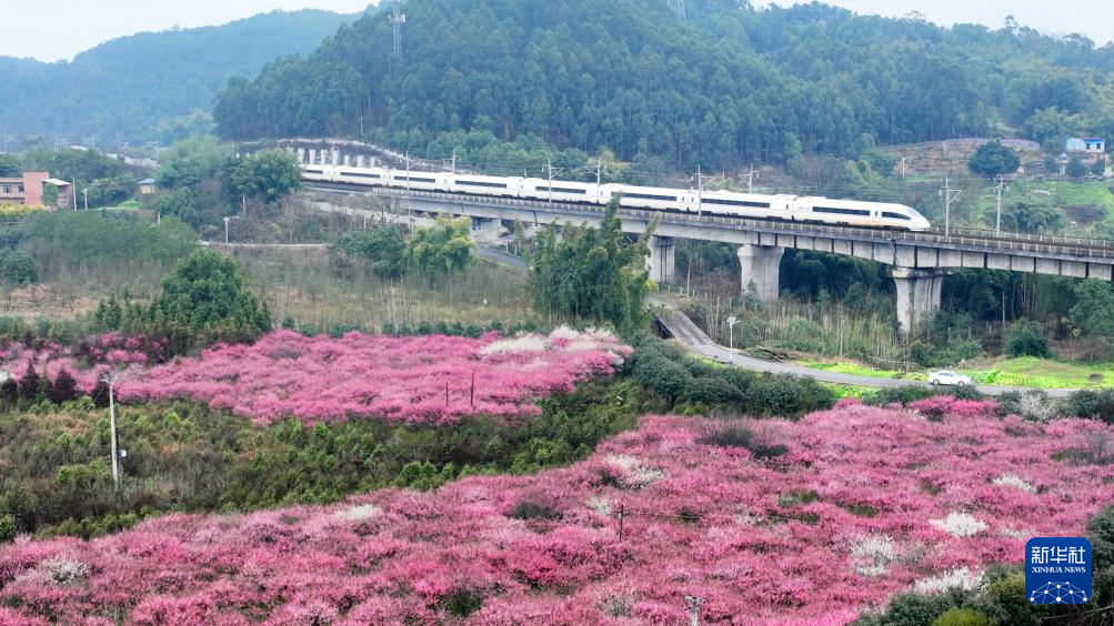 2月13日,在重庆市永川区大安街道德胜桥村,一列高铁列车驶过一片梅花花海。