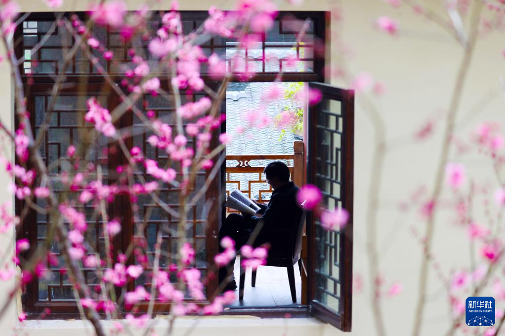 2月15日,村民在重庆市黔江区太极镇李子村梅花掩映下的金鸡书院里读书。