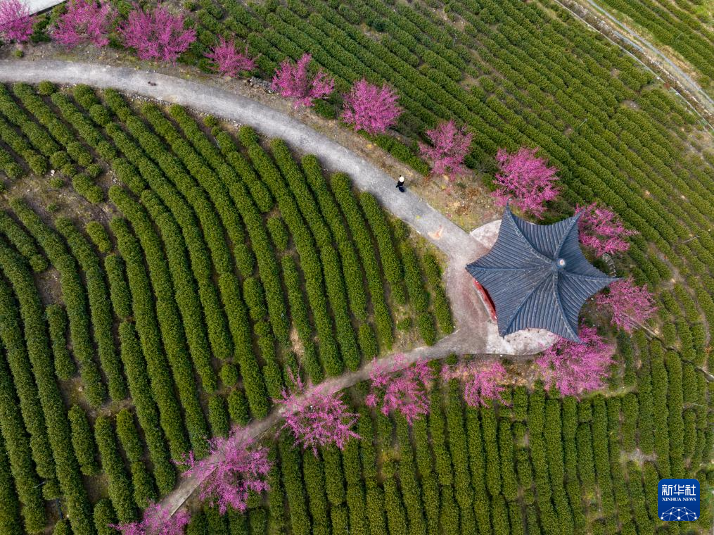 2月16日,游客在湖北省宜昌市秭归县茅坪镇建东村的一处高山茶园赏花游玩(无人机照片)。