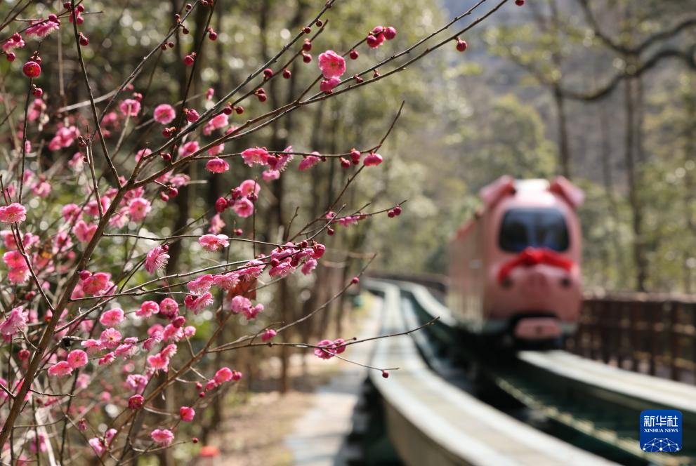 2月15日,游人在湖南张家界国家森林公园十里画廊乘观光电车赏花游玩。