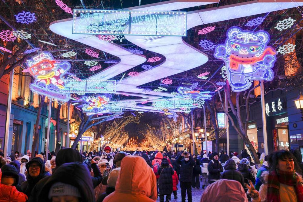 1月30日,游客在哈尔滨中央大街上的亚冬会主题灯饰下游玩、拍照。新华社记者 王建威 摄