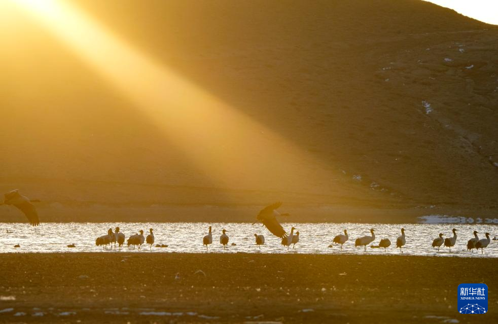2月20日清晨,第一缕阳光照耀在西藏拉萨市林周县越冬的黑颈鹤身上。