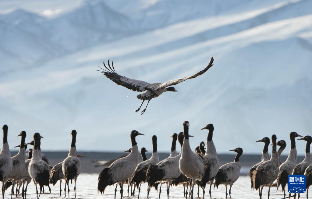 西藏自治区拉萨市林周县平均海拔约4200米,是黑颈鹤的主要越冬地之一。一场冬雪,将林周县虎头山水库染成一片银白,黑颈鹤仿佛是这洁白舞台优雅的舞者。