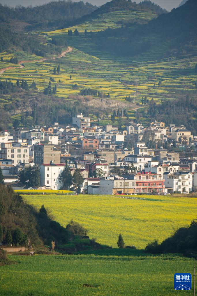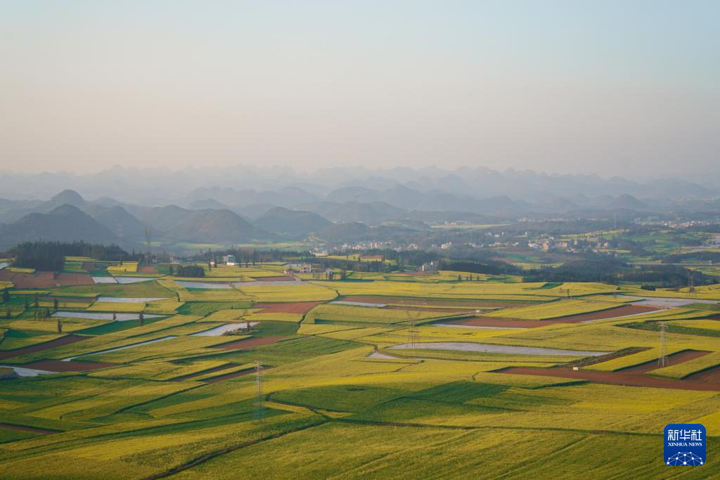 近日,云南省曲靖市罗平县百万亩油菜花竞相绽放,金黄色的油菜花田与山峦、村庄相互映衬,构成了如诗如画的田园风光,吸引各地游客前来观花赏景。