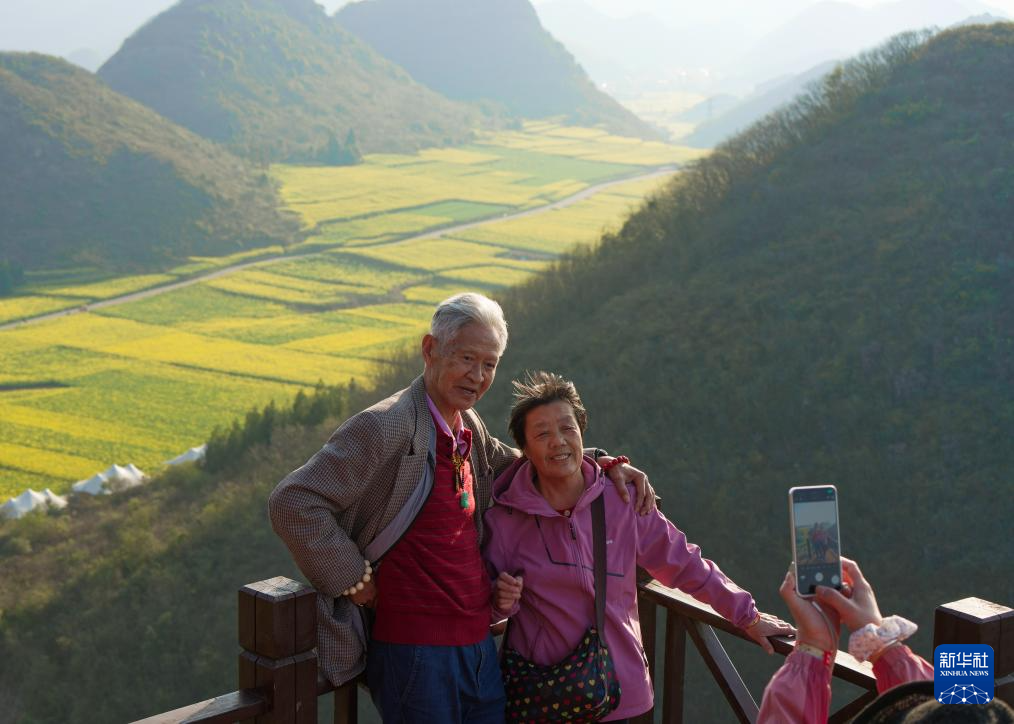 3月2日,游客在云南省罗平县金鸡峰丛拍照打卡。