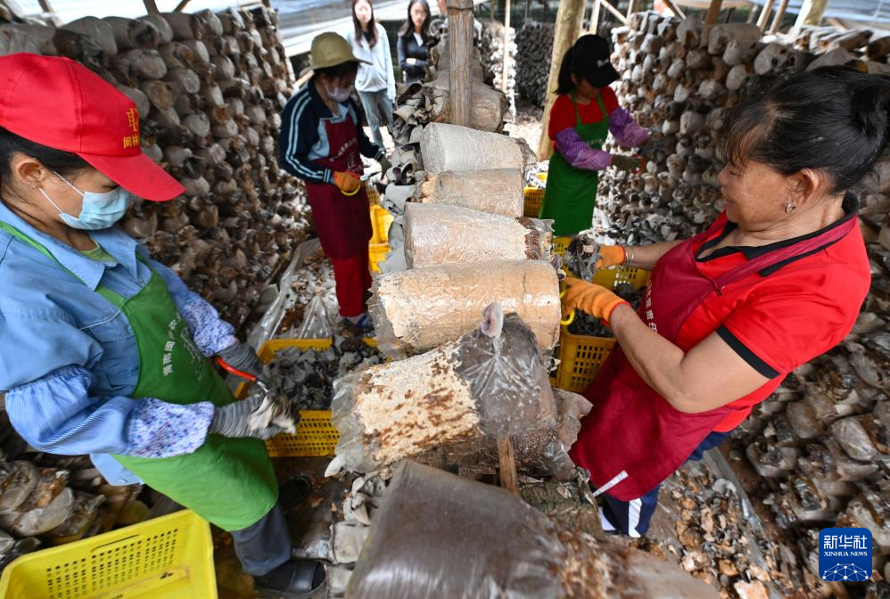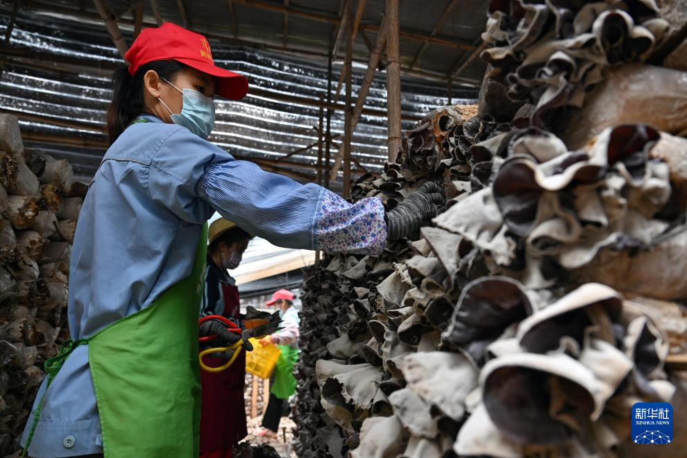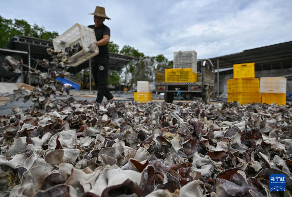 3月13日,海南省儋州市大成镇推赛村的农户在采收木耳。