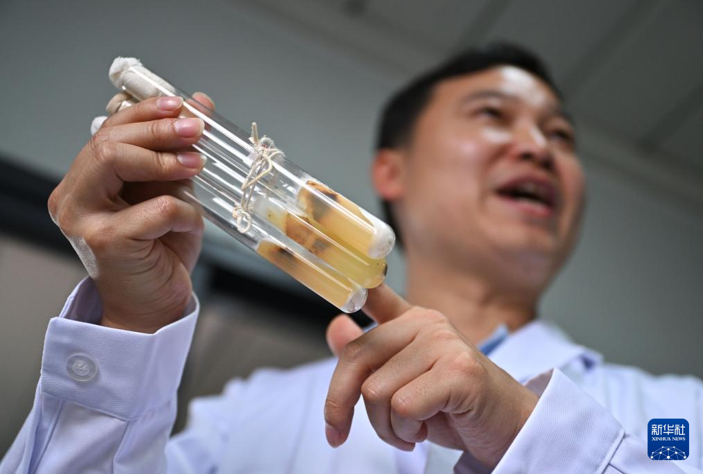 3月13日,海南儋州食用菌科技小院负责人罗灿在实验室和学生交流白背毛木耳母种繁育情况。