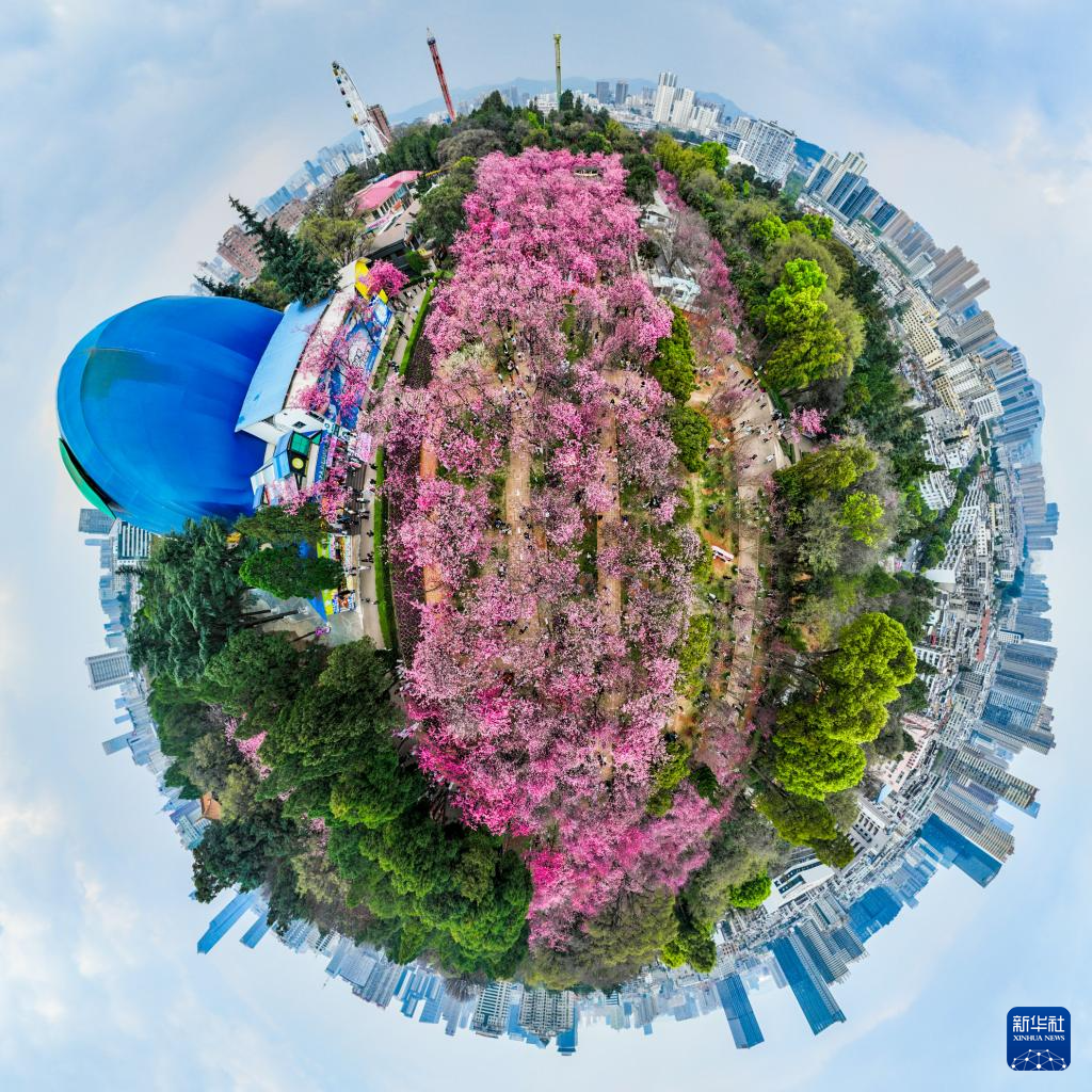 昆明圆通山公园里盛开的樱花(无人机全景照片,3月14日摄)。